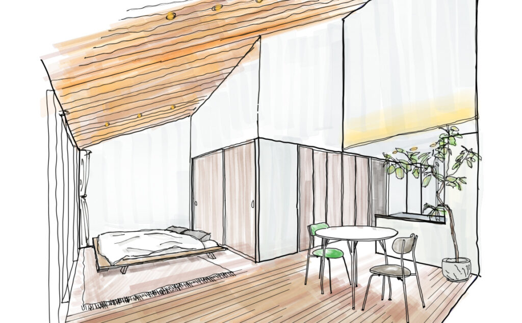 ご案内時には、こちら(↓)のようなスケッチ描いてリノベーションの完成イメージをお客様と共有しましたが、詳細なリノベ計画はこれからです。