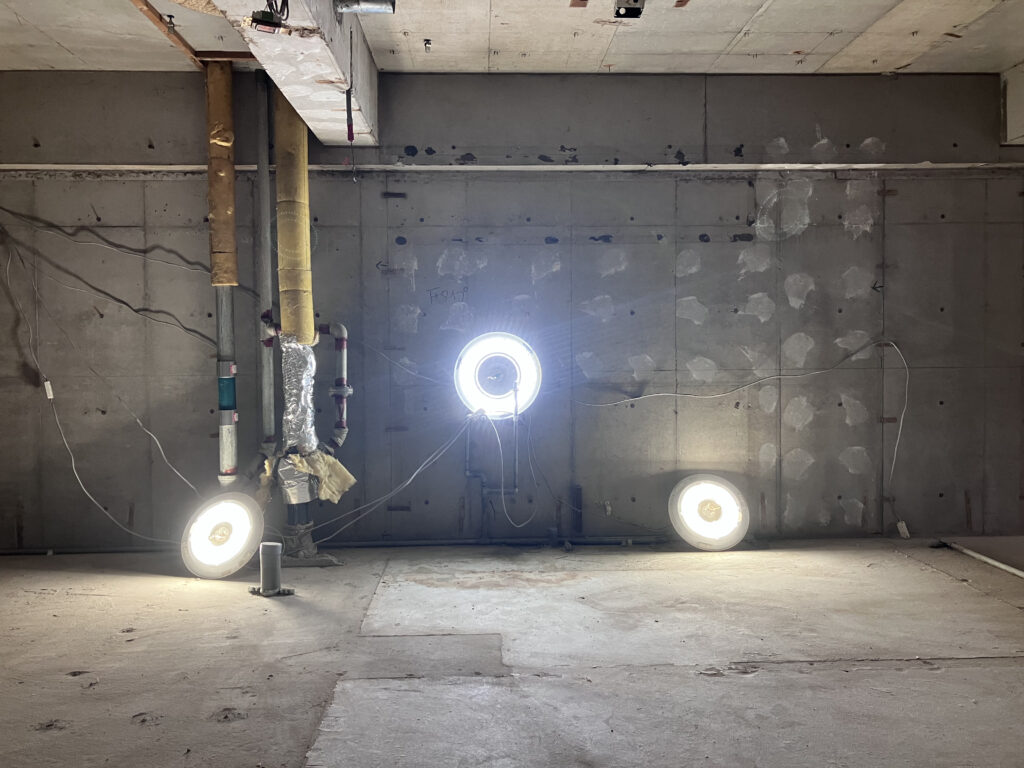 スケルトン空間に丸い照明が無作為に置かれているだけなのに、なんだかアートっぽさを感じちゃいます。
